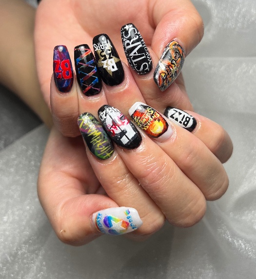 ライブの時はネイルもライブ使用(全部手描きです✨️)で派手派手ですし、この時のライブツアーは稲葉さんの髪型に寄せたく前髪をハイライト入れまくってました☺️ネイルも髪の毛もお気に入りでした♡